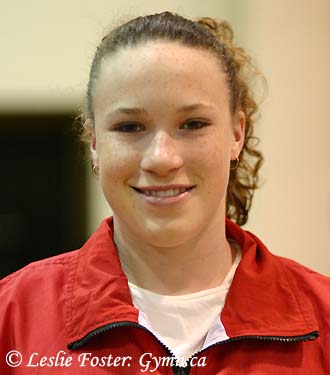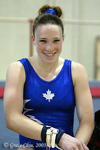 With the world individual apparatus championships approaching, and being in her first year of senior FIG eligibility, Purnell was one of the favourites to represent Canada that fall in Debrecen, Hungary. But after a long and successful competitive season to that point, Purnell and her coaches made the decision to not seek a berth on the world team in order to focus on training for 2003. A confident Purnell entered December’s Elite Canada competition in Gatineau, Quebec as a clear favourite, and a four for four showing there earned her the all-around title. There she debuted a few new skills including a switch ring leap on beam and a piked Luconi second vault to go with her now well consolidated Yurchenko 1 ½.